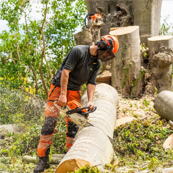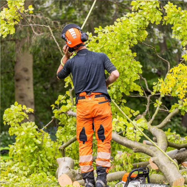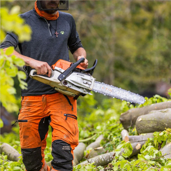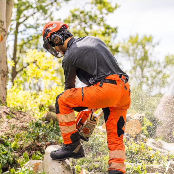 高強度ポリマーを使用したこのズボンは体をしっかりと保護しながらも、現場や樹冠の周囲を楽に移動するのに必要な柔軟性を確保しています。